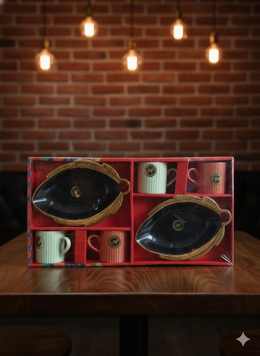 Seramik Set 4 Cups pattern design and 2 Leafs with golden touch design