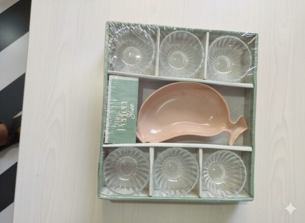 Glsaa and Plastic 6 wati/katori and one Mango shape design bowl